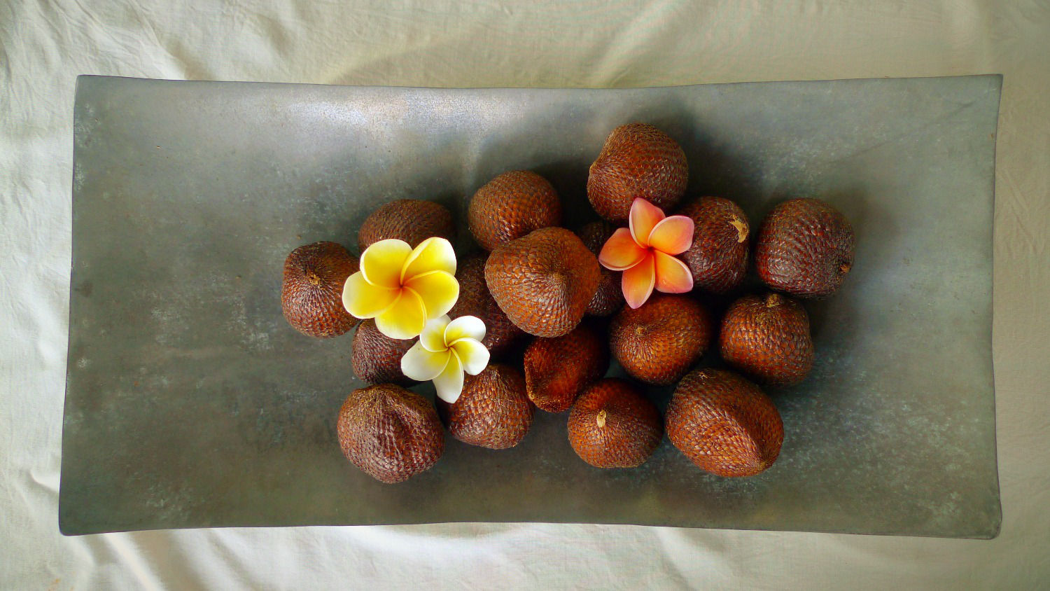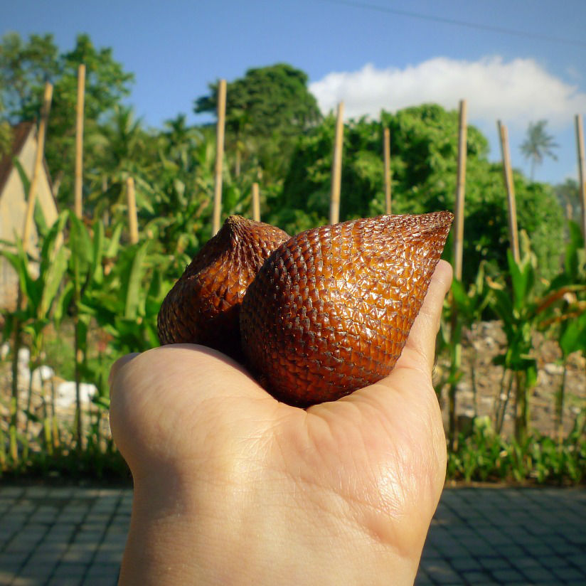 Salak (Salacca zalacca) known as snake fruit in English. It is native Indonesia in Java and Sumatra, and further naturalized in Bali, Lombok, and Sulawesi. It is a species from palm tree family and cultivated around the region for food crops. As like other palm tree families, the fruits are grown in clusters at the base of the palm. It is called snake fruit due to the scaly skin as the one on the snakes. It consist of three lobes where the big lobe will consist a seed, while the smaller ones are usually empty.